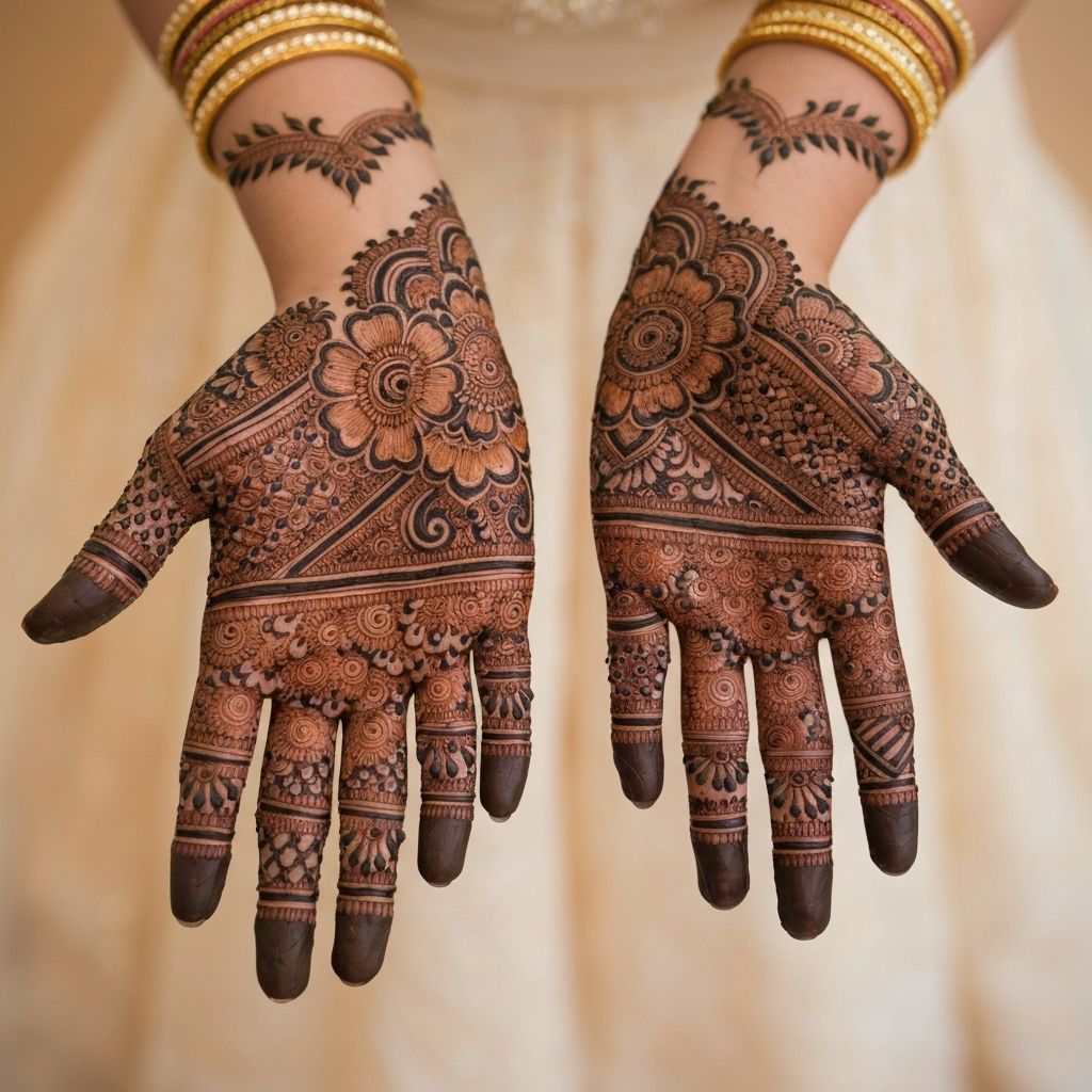 Discover our stunning collection of traditional Indian bridal mehndi featuring intricate patterns, peacocks, and royal detailing